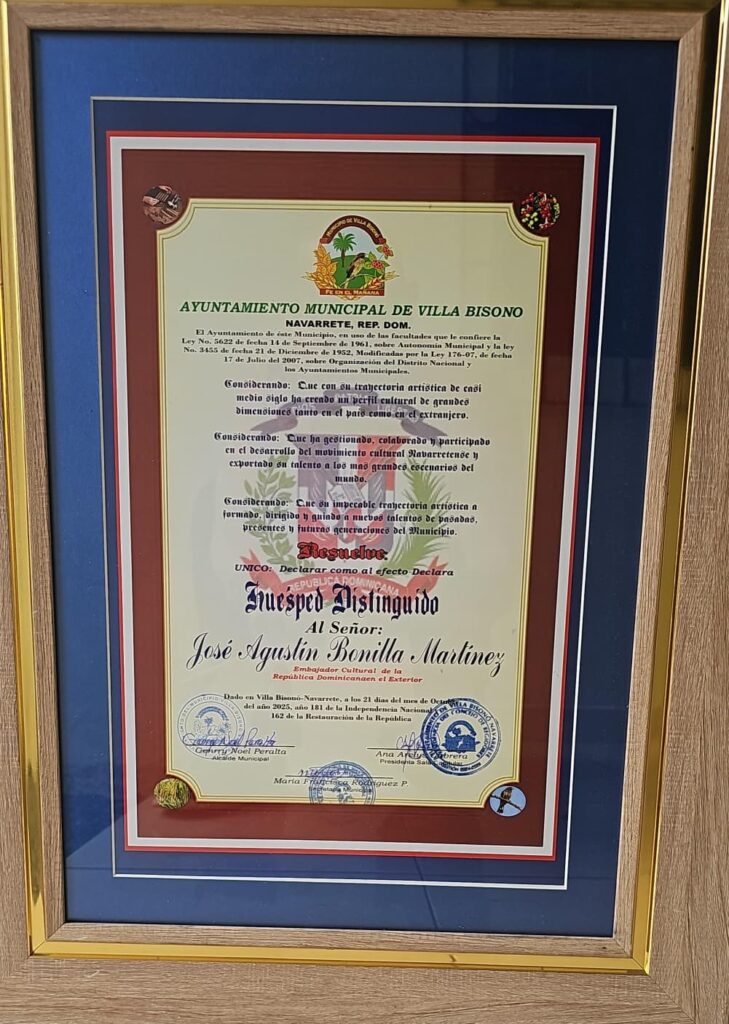 Con este nombramiento, José Agustín Bonilla Martínez se convierte en el primer Embajador Cultural de Villa Bisonó-Navarrete, consolidando su legado como uno de los grandes promotores de la cultura dominicana en el extranjero.