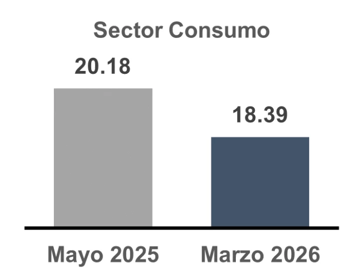 Al mismo tiempo, la tasa activa del sector de manufactura registró una disminución de 190 puntos básicos, pasando de 13.15 % en mayo 2025 a 11.25 % en marzo 2026.