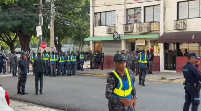 SANTO DOMINGO.– Un amplio dispositivo de agentes policiales fue desplegado este domingo en los alrededores del Palacio de Justicia de Ciudad Nueva, ante la convocatoria de una protesta realizada por diversas organizaciones sociales y figuras públicas para exigir prisión preventiva contra los imputados en el caso de presunto desfalco al Seguro Nacional de Salud (SeNaSa), conocido como Operación Cobra.